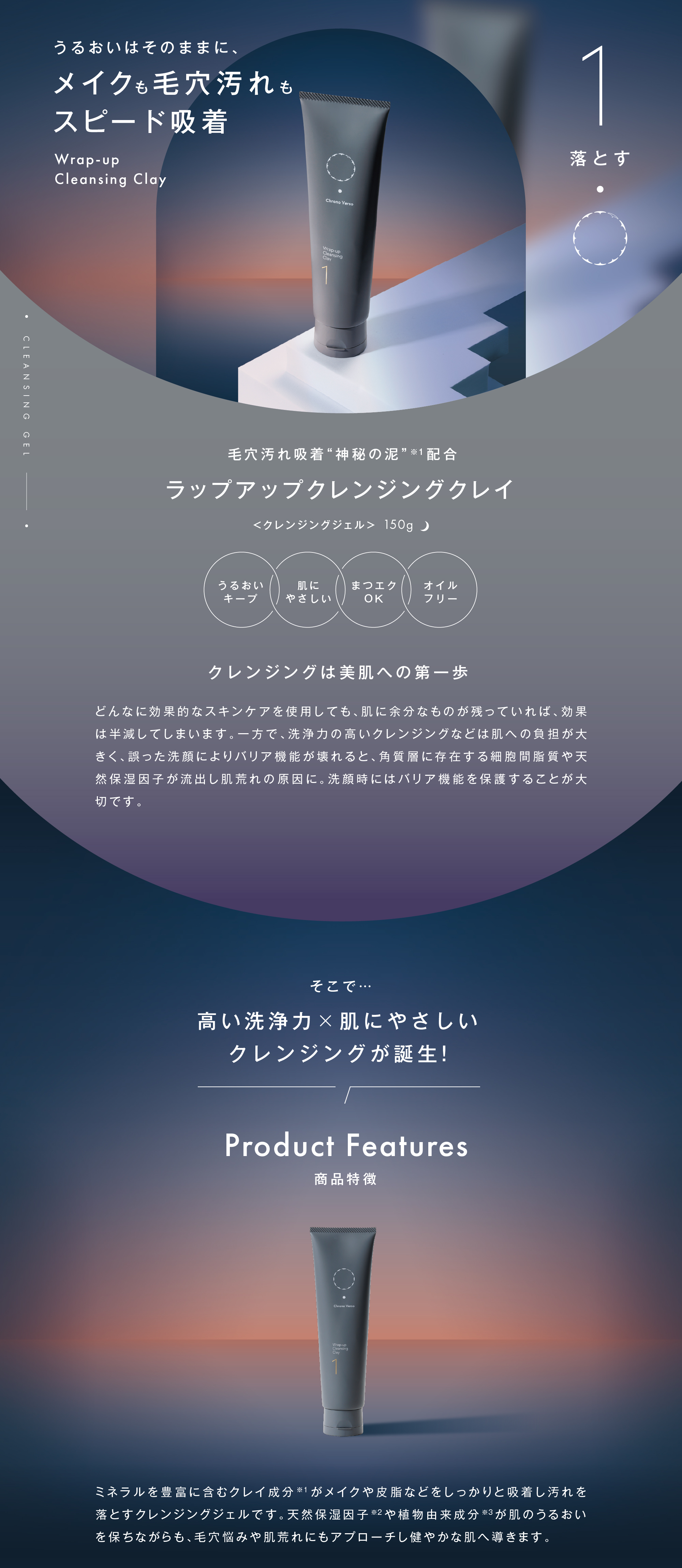 | 特徴 | ミネラルを豊富に含むクレイ成分※1がメイクや皮脂などをしっかりと吸着し汚れを落とすクレンジングジェルです。天然保湿因子※2やセラミド成分※3が肌のうるおいを保ちながらも、毛穴悩みや肌荒れにもアプローチし健やかな肌へ導きます。 ※1:シルト(整肌成分) ※2:PCA-Na、乳酸Na、アルギニン、アスパラギン酸、PCA、グリシン、アラニン、セリン、バリン、プロリン、イソロイシン、トレオニン、フェニルアラニン、ヒスチジン(整肌成分) ※3:ラウロイルグルタミン酸ジ(フィトステリル/オクチルドデシル)(整肌成分) |