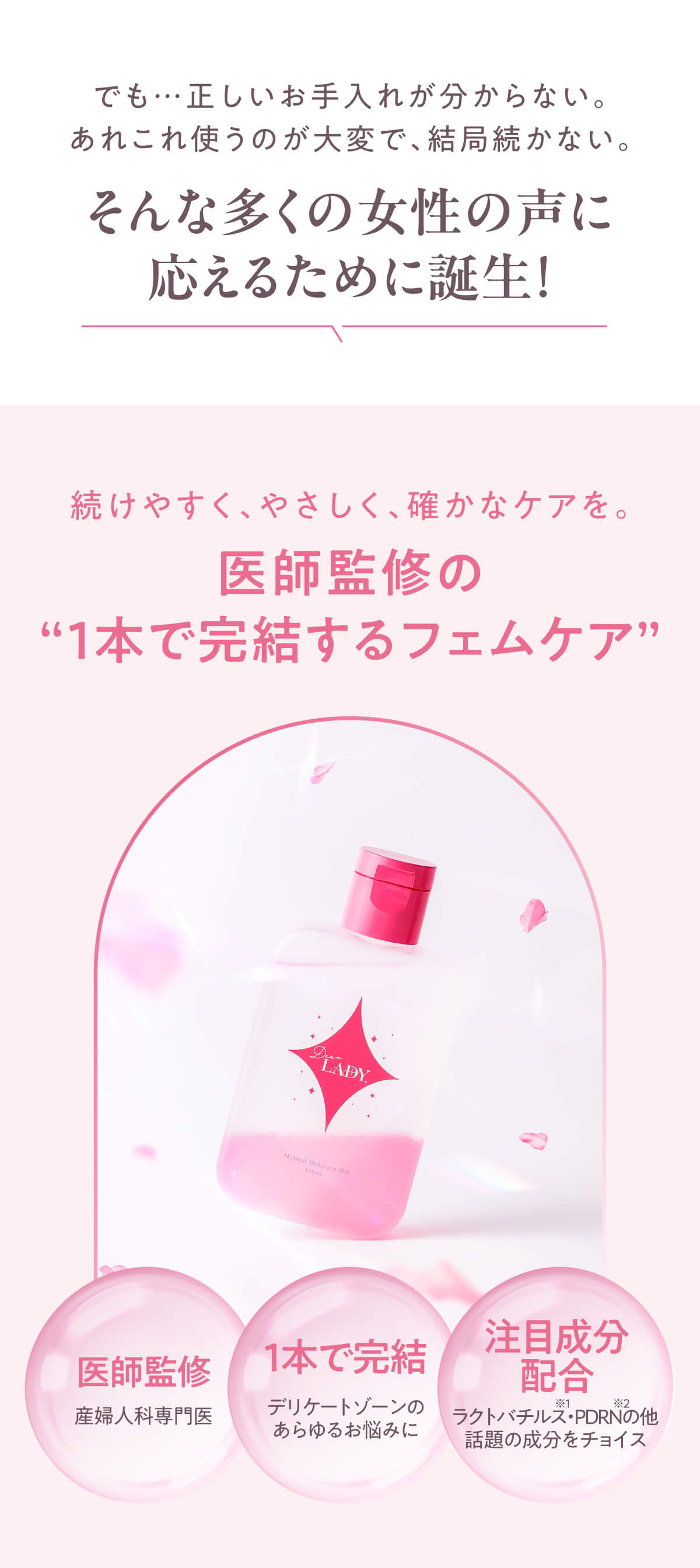 | 特徴 | 日本専門医機構認定・産婦人科専門医が監修した二層式デリケートゾーンケアオイル。 オイル層が汚れをやさしく落としながら保護し、美容液層がうるおいと透明感を与えます。美容成分には、美容医療業界で注目のPDRN(サーモンDNA)と、健やかなデリケートゾーン維持に欠かせないラクトバチルス・クリスパタス菌KT-11を配合。 “洗う・うるおす・整える”を1本で叶える、毎日安心して続けられる医師発想のデリケートケアです。 |
