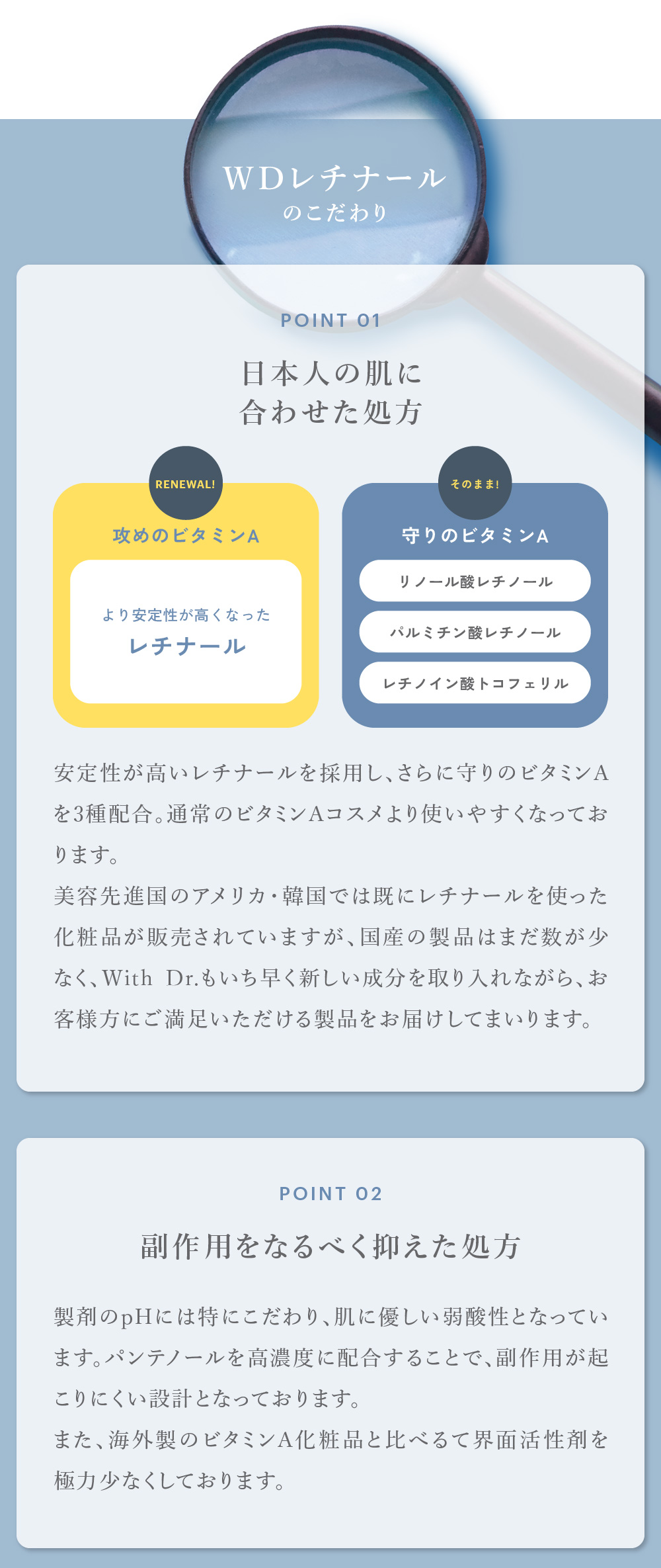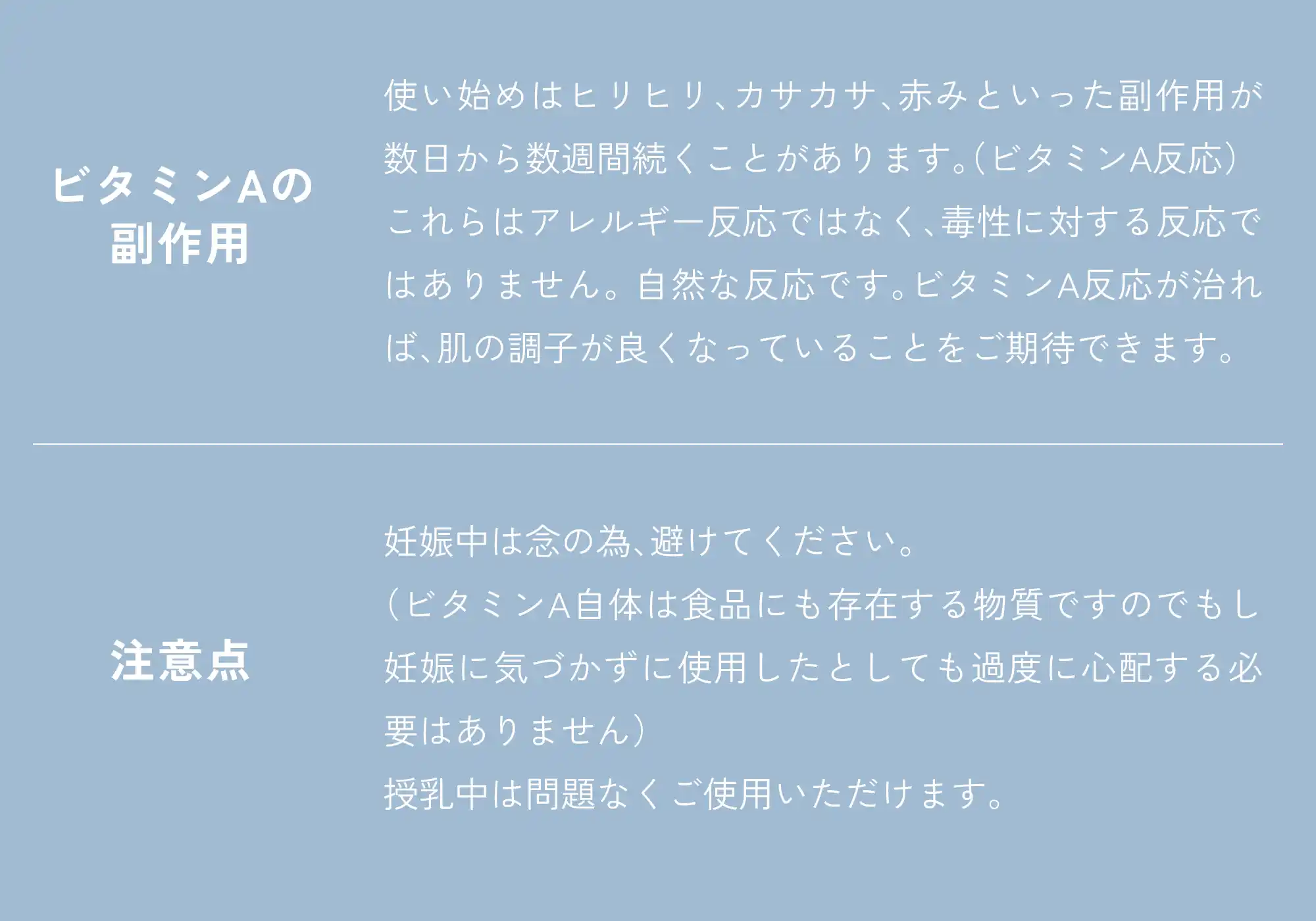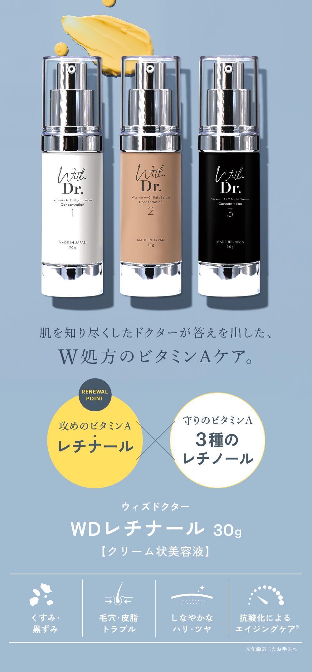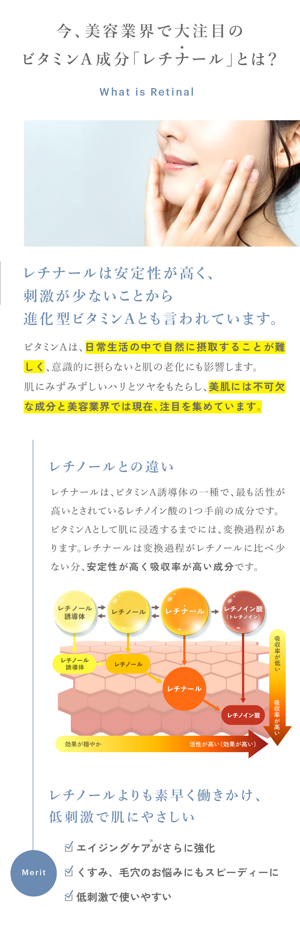 | 特徴 | 日本人のためのビタミンAコスメ。やさしく働くレベル1から肌に確かな実感をもたらすレベル3までの3段階設定。お肌に合わせてお選びいただけます。 レベル1はビタミンAコスメ初心者の方でも毎日使えるやさしいビタミンAクリーム。レベル2は反応を抑えながらも着実な実感が得られる絶妙なビタミンA濃度に設計したビタミンAクリーム。レベル3は医療機関のみで購入可能な高濃度処方。肌にアグレッシブな実感をもたらします。 肌へアクティブにはたらくレチナール、透明感をもたらすリノール酸レチノール、守りのビタミンAパルミチン酸レチノール、肌にうるおいをもたらすレチノイン酸トコフェリルを配合。それぞれ異なる働きを持つ4種類のビタミンAが相乗的に働きます。さらに肌になじみやすく長く働く油溶性ビタミンC「VCIP」や肌を明るく導く「VCエチル」といったビタミンC誘導体を配合し、肌のくすみにアプローチいたします。また、ビタミンAによるネガティブな反応を極力抑えるために、複数の抗炎症成分をはじめ、肌のバリア機能を高めるセラミドやパンテノールといったリペア成分を配合しています。ビタミンAのもつパワフルなアプローチと肌を守るやさしさを兼ね備えたビタミンAクリームです。 |