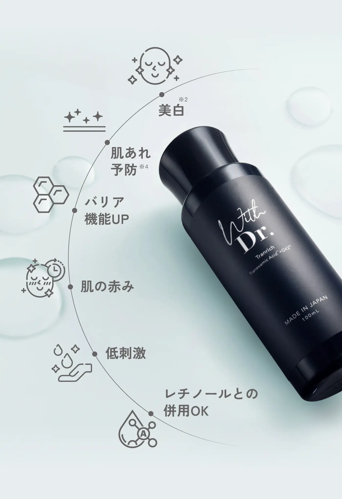 | 特徴 | 美容医療発想で開発された薬用美白(※1)化粧水。 美白(※1)有効成分【トラネキサム酸(※2)】と、肌あれ防止(※3)有効成分【グリチルリチン酸2K(※4)】を配合。さらに肌バリア機能を支える保湿成分も配合。 "攻めと守り"を両立した処方で肌をすこやかに保ち、明るい印象に導きます。 レチチール(ビタミンA)を含むアイテムとライン使いしやすいよう配慮された処方設計で、毎日のスキンケアに取り入れやすいアイテムです。 ※1 メラニンの生成を抑えてしみ・そばかすを防ぐ ※2 トラネキサム酸(美白有効成分) ※3 乾燥や外部刺激による肌あれ ※4 グリチルリチン酸2K(肌あれ有効成分) |